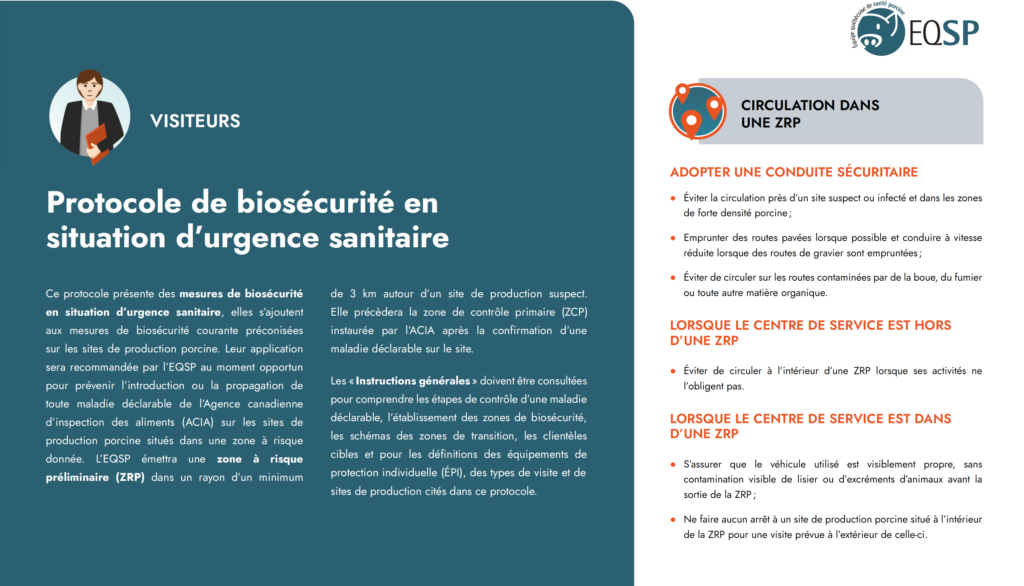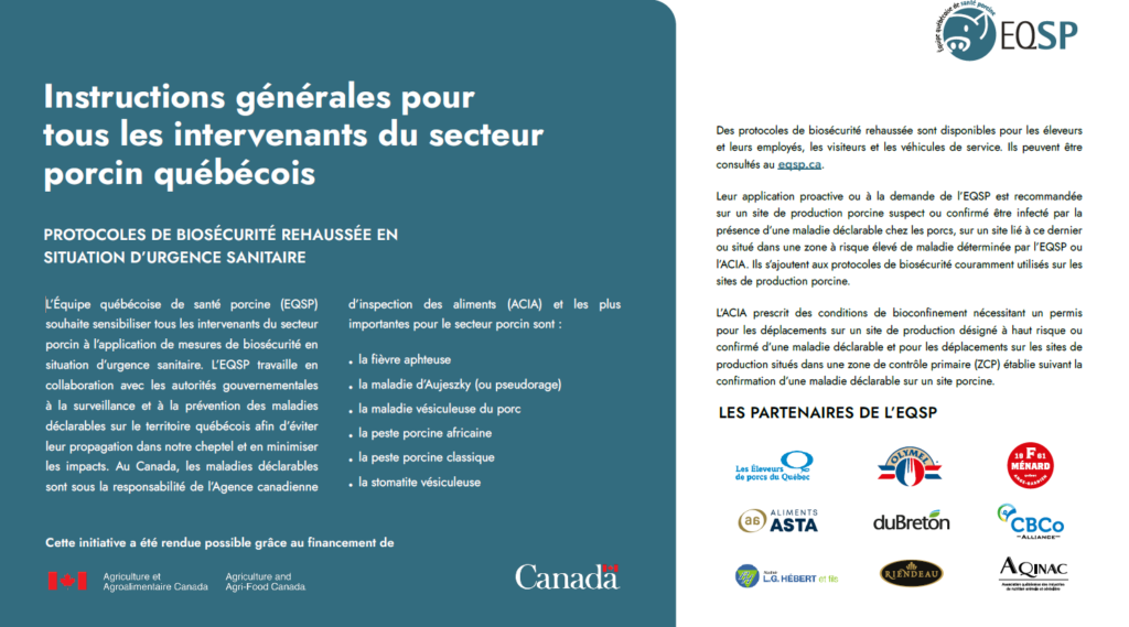 L’Équipe québécoise de santé porcine (EQSP) souhaite sensibiliser tous les intervenants du secteur porcin à l’application de mesures de biosécurité en situation d’urgence sanitaire. L’EQSP travaille en collaboration avec les autorités gouvernementales à la surveillance et à la prévention des maladies déclarables sur le territoire québécois afin d’éviter leur propagation dans notre cheptel et en minimiser les impacts.